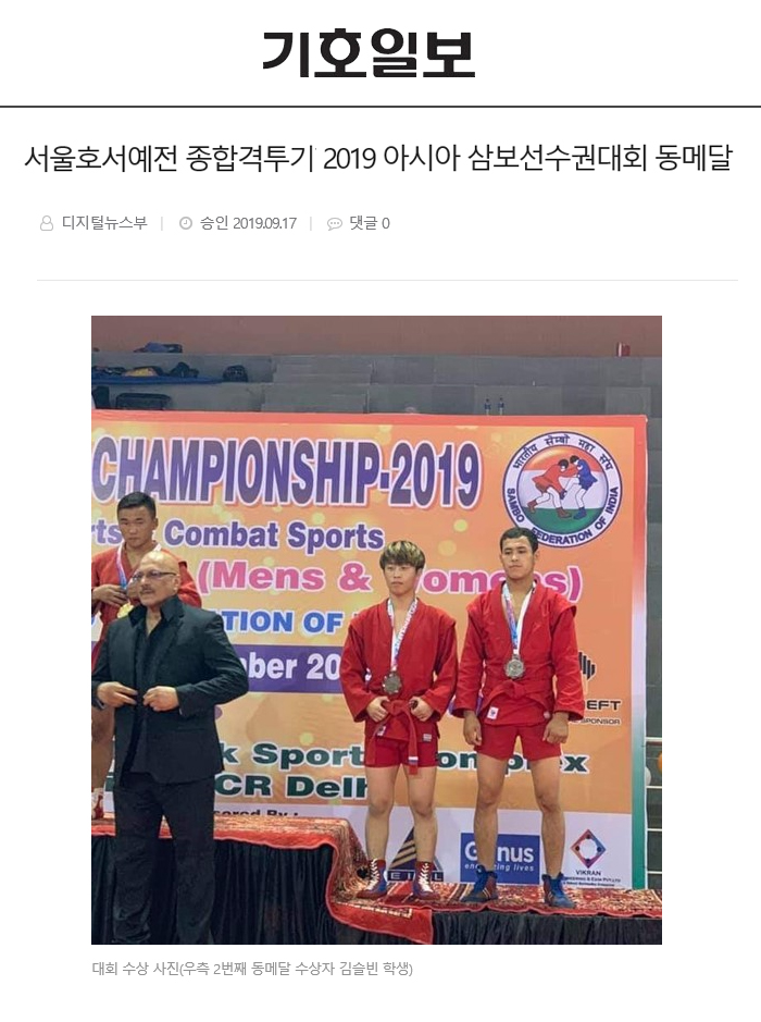서울호서예술실용전문학교(이하 서울호서예전) 스포츠건강관리계열 내 종합격투기과정이 지난 13일부터 15일까지 인도 뉴델리에서 열린 ‘2019아시아 삼보선수권대회’에서 동메달 수상자를 배출했다. 수상자는 19학번 종합격투기 전공 김슬빈 학생이다.