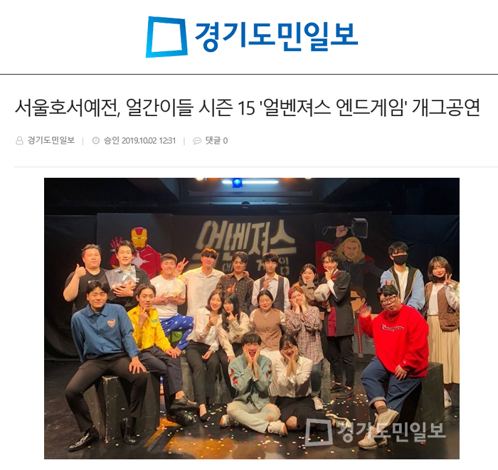 서울호서예술실용전문학교(이하 서울호서예전) 연기예술계열에서는 정기공연인 얼간이들 시즌 15 '얼벤져스 엔드게임' 개그 공연을 성황리에 마쳤다고 1일 전했다.