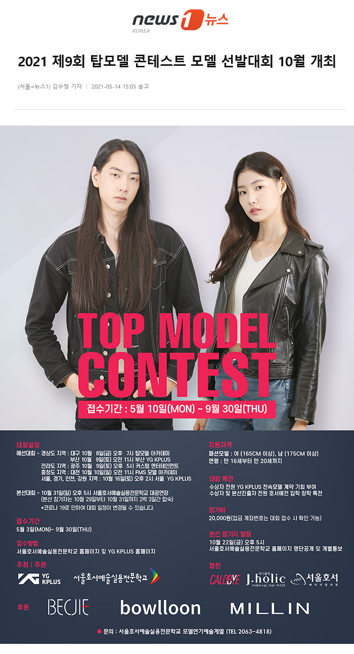 2021 제9회 탑 모델 콘테스트는 백지애웨딩(BECJIE), 보울룬(bowlloon), 밀린(MILLIN)이 후원하고, 칼로바이, 제이홀릭 메이크업, 서울호서메이크업이 협찬하며 대회접수는 오는 9월 30일까지 서울호서예술실용전문학교 홈페이지에서 가능하다.