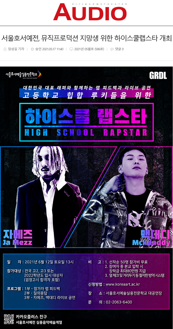 서울호서예술실용전문학교(이하 서울호서예전)가 뮤직프로덕션 지망생들을 위한 ‘하이스쿨랩스타’를 오는 6월 12일(토) 오후1시에 개최한다.