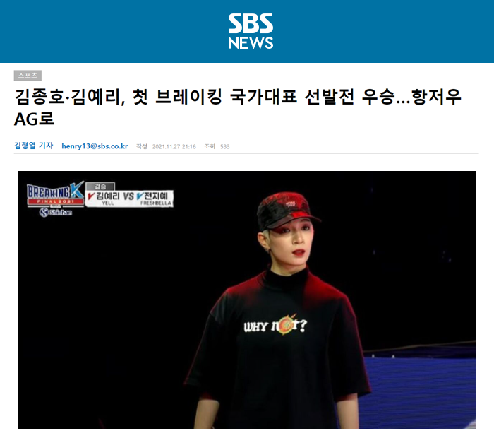 [언론보도] 김예리, 첫 브레이킹 국가대표 선발전 우승…항저우AG로