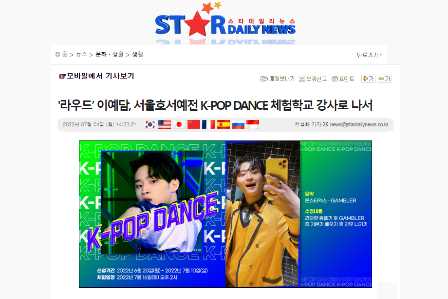 [언론보도] '라우드’ 이예담, 서울호서예전 K-POP DANCE 체험학교 강사로 나서