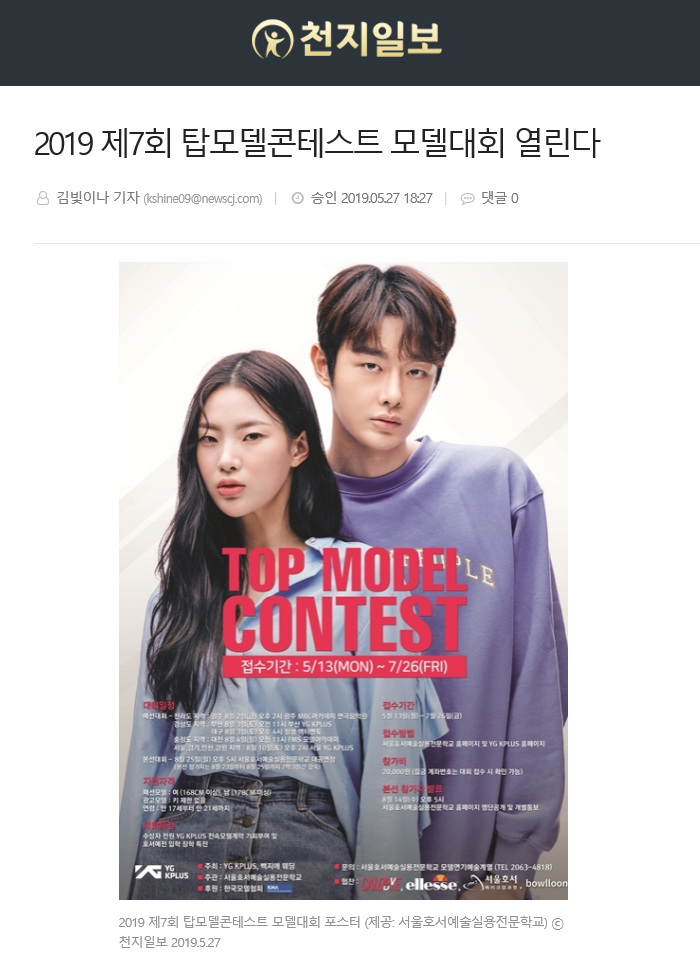 서울호서예술실용전문학교가 주관하고, YG케이플러스와 백지애웨딩이 주최하고, 한국모델협회가 후원하는 제7회 탑모델콘테스트 모델선발대회가 오는 8월 25일 개최된다.