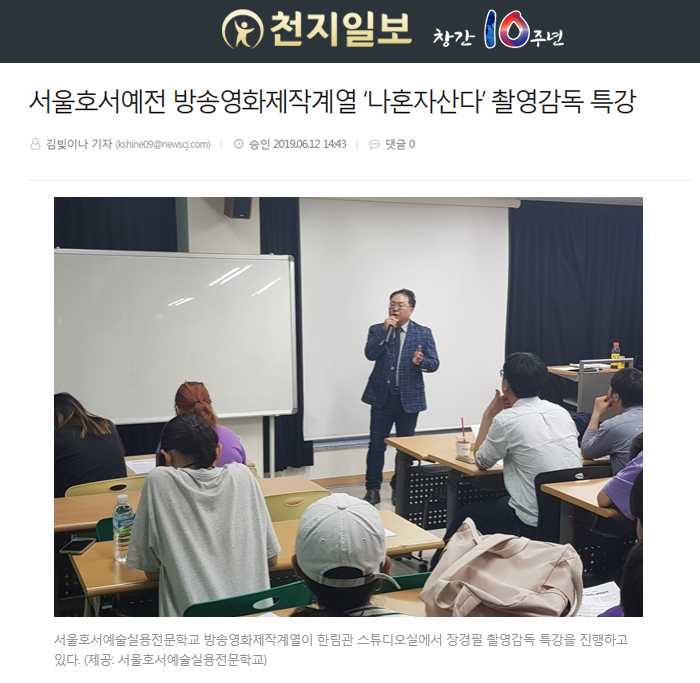 [천지일보=김빛이나 기자] 서울호서예술실용전문학교 방송영화제작계열이 최근 교내 한림관 스튜디오실에서 실무수업의 일환으로 MBC ‘무한도전’ ‘나 혼자 산다’ SBS ‘불타는 청춘’ 등 방송경력 25년의 베테랑 장경필 촬영감독의 특강을 진행했다고 12일 밝혔다.