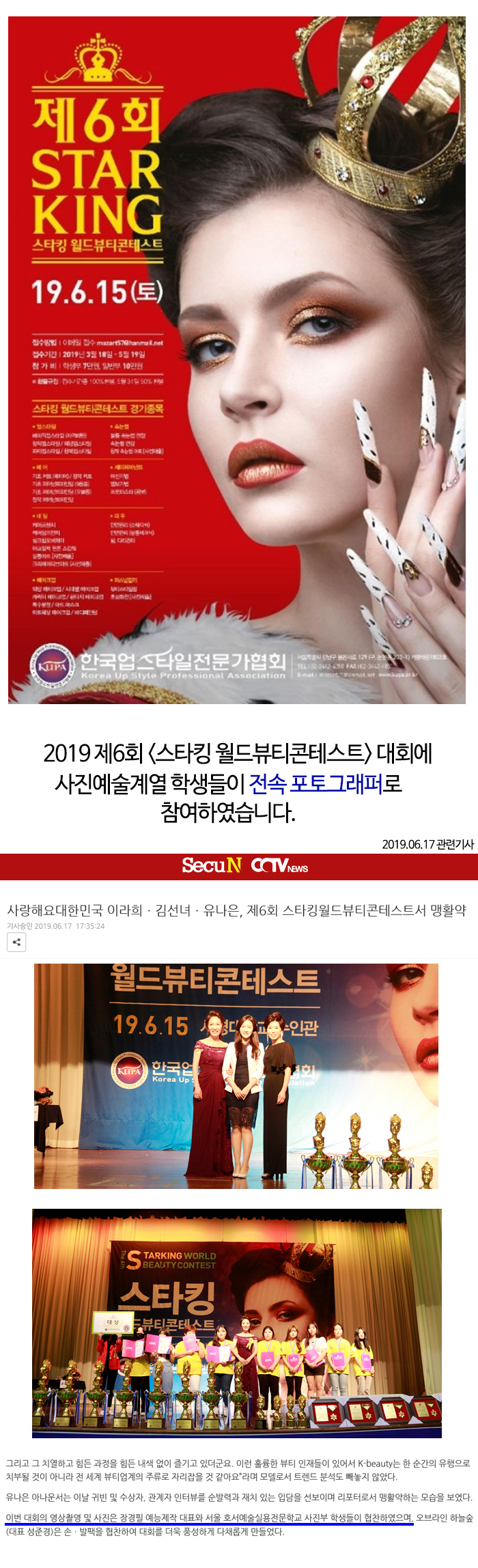 6월 15일(토) 2019 제6회 <스타킹 월드뷰티콘테스트> 대회에 사진예술계열 학생들이 전속 포토그래퍼로 참여하였습니다.