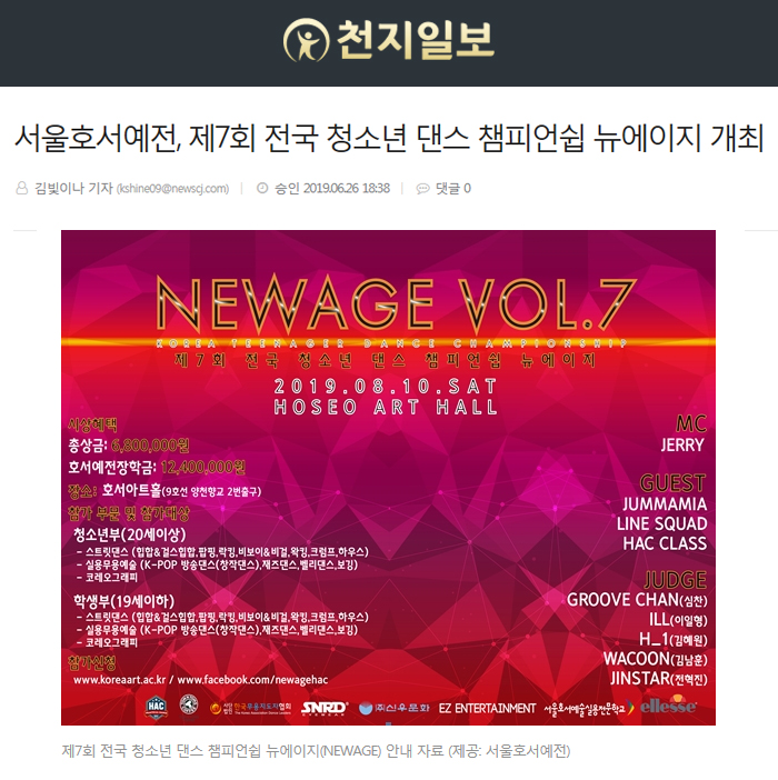 서울호서예술실용전문학교(서울호서예전)가 주최하고, EZ ENT(이지엔터테인먼트)가 주관 진행하는 제7회 전국 청소년 댄스 챔피언쉽 뉴에이지(NEWAGE)가 오는 8월 10일 오후 1시 호서아트홀에서 개최된다. 행사 협찬은 ㈜신우문화, 한국무용지도자협회, 탐앤탐스, 엘레쎄, SNRD가 각각 참여한다.