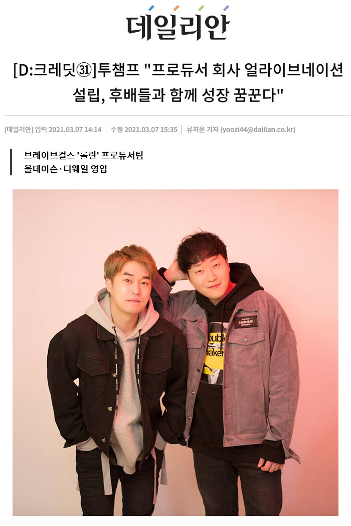 [언론보도]투챔프 "프로듀서 회사 얼라이브네이션 설립, 후배들과 함께 성장 꿈꾼다"