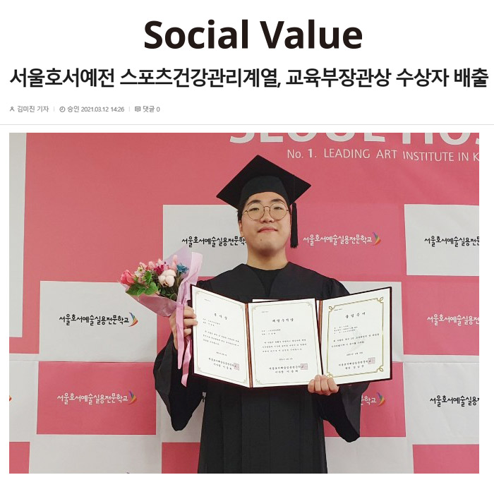 서울호서예술실용전문학교(이하 서울호서예전) 스포츠건강관리계열 이동원 학생이 전문학사 과정을 성실히 이수해 학위 취득뿐만 아니라 교육 성과가 우수하고 타의 모범이 되어 교육부장관상을 수상했다.