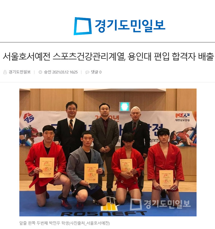 서울호서예술실용전문학교(이하 서울호서예전) 스포츠건강관리계열 박민우 학생이 해당 학교 졸업과 동시에 용인대학교 격기과에 편입했다고 학교 관계자가 전했다.