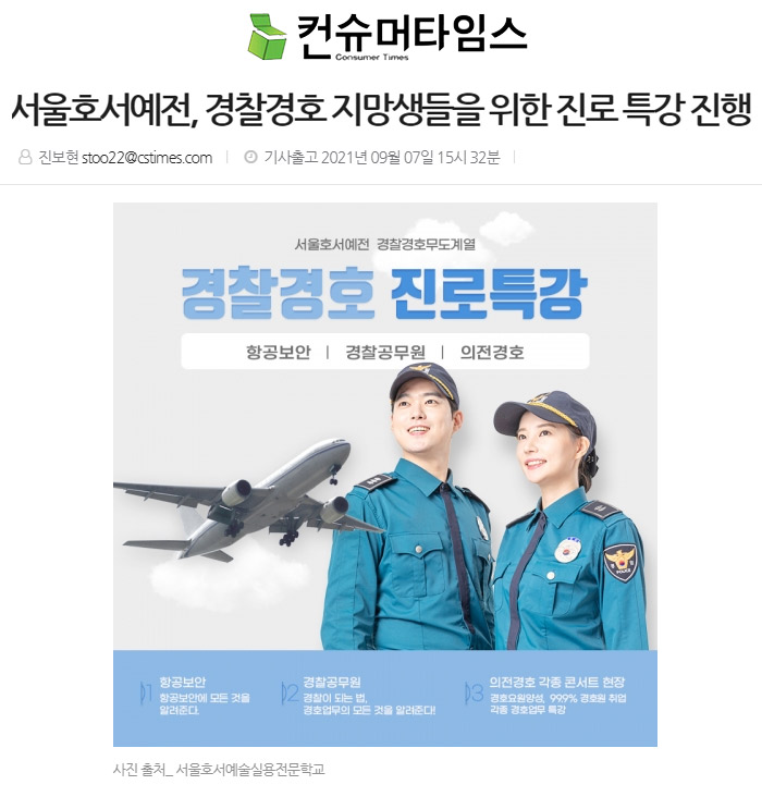 서울호서예술실용전문학교(이하 서울호서예전) 경찰경호계열에서는 경찰경호과 진학을 앞둔 학생들을 위한 진로 특강을 진행한다고 밝혔다.