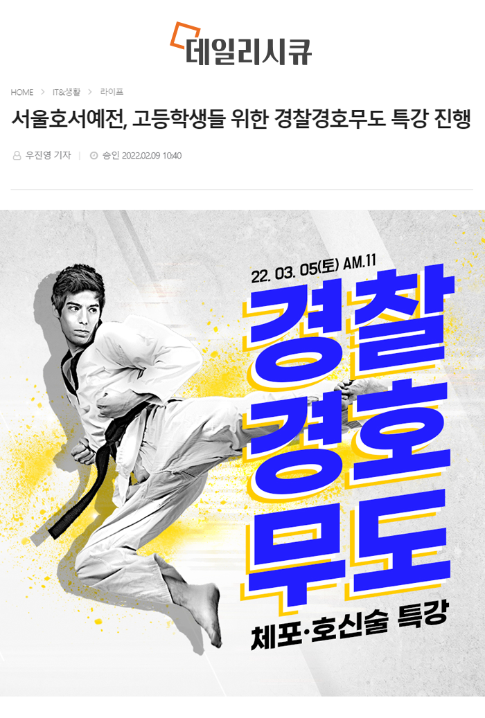 특강은 3월 5일 토요일 오전 11시에 진행된다. 참가비는 무료이며 경찰경호무도 특강을 주최하는 서울호서예전 홈페이지에서 신청할 수 있다. 현재 선착순으로 신청을 받고 있는 중이다.